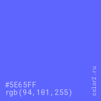 Цвет #5E65FF в цветовой модели RGB обозначается тремя октетами (94, 101, 255) в десятичном формате и #5E65FF в шестнадцатиричном (hex) формате, которые являются интенсивностью красного 94 (hex 5E), интенсивность зелёного 101 (hex 65) и интенсивность синего 255 (hex FF).