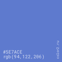 Цвет #5E7ACE в цветовой модели RGB обозначается тремя октетами (94, 122, 206) в десятичном формате и #5E7ACE в шестнадцатиричном (hex) формате, которые являются интенсивностью красного 94 (hex 5E), интенсивность зелёного 122 (hex 7A) и интенсивность синего 206 (hex CE).