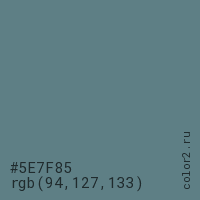 Цвет #5E7F85 в цветовой модели RGB обозначается тремя октетами (94, 127, 133) в десятичном формате и #5E7F85 в шестнадцатиричном (hex) формате, которые являются интенсивностью красного 94 (hex 5E), интенсивность зелёного 127 (hex 7F) и интенсивность синего 133 (hex 85).