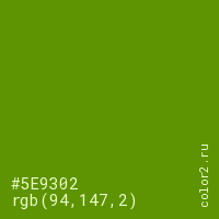 Цвет #5E9302 в цветовой модели RGB обозначается тремя октетами (94, 147, 2) в десятичном формате и #5E9302 в шестнадцатиричном (hex) формате, которые являются интенсивностью красного 94 (hex 5E), интенсивность зелёного 147 (hex 93) и интенсивность синего 2 (hex 02).