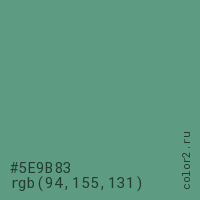 Цвет #5E9B83 в цветовой модели RGB обозначается тремя октетами (94, 155, 131) в десятичном формате и #5E9B83 в шестнадцатиричном (hex) формате, которые являются интенсивностью красного 94 (hex 5E), интенсивность зелёного 155 (hex 9B) и интенсивность синего 131 (hex 83).