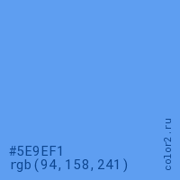 Цвет #5E9EF1 в цветовой модели RGB обозначается тремя октетами (94, 158, 241) в десятичном формате и #5E9EF1 в шестнадцатиричном (hex) формате, которые являются интенсивностью красного 94 (hex 5E), интенсивность зелёного 158 (hex 9E) и интенсивность синего 241 (hex F1).