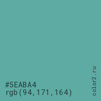 Цвет #5EABA4 в цветовой модели RGB обозначается тремя октетами (94, 171, 164) в десятичном формате и #5EABA4 в шестнадцатиричном (hex) формате, которые являются интенсивностью красного 94 (hex 5E), интенсивность зелёного 171 (hex AB) и интенсивность синего 164 (hex A4).