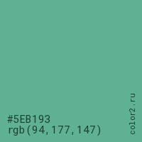 Цвет #5EB193 в цветовой модели RGB обозначается тремя октетами (94, 177, 147) в десятичном формате и #5EB193 в шестнадцатиричном (hex) формате, которые являются интенсивностью красного 94 (hex 5E), интенсивность зелёного 177 (hex B1) и интенсивность синего 147 (hex 93).