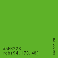 Цвет #5EB228 в цветовой модели RGB обозначается тремя октетами (94, 178, 40) в десятичном формате и #5EB228 в шестнадцатиричном (hex) формате, которые являются интенсивностью красного 94 (hex 5E), интенсивность зелёного 178 (hex B2) и интенсивность синего 40 (hex 28).