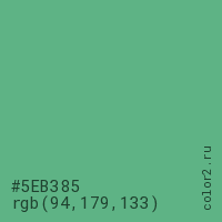 Цвет #5EB385 в цветовой модели RGB обозначается тремя октетами (94, 179, 133) в десятичном формате и #5EB385 в шестнадцатиричном (hex) формате, которые являются интенсивностью красного 94 (hex 5E), интенсивность зелёного 179 (hex B3) и интенсивность синего 133 (hex 85).