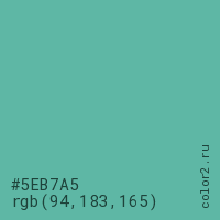 Цвет #5EB7A5 в цветовой модели RGB обозначается тремя октетами (94, 183, 165) в десятичном формате и #5EB7A5 в шестнадцатиричном (hex) формате, которые являются интенсивностью красного 94 (hex 5E), интенсивность зелёного 183 (hex B7) и интенсивность синего 165 (hex A5).