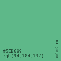Цвет #5EB889 в цветовой модели RGB обозначается тремя октетами (94, 184, 137) в десятичном формате и #5EB889 в шестнадцатиричном (hex) формате, которые являются интенсивностью красного 94 (hex 5E), интенсивность зелёного 184 (hex B8) и интенсивность синего 137 (hex 89).