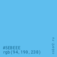 Цвет #5EBEEE в цветовой модели RGB обозначается тремя октетами (94, 190, 238) в десятичном формате и #5EBEEE в шестнадцатиричном (hex) формате, которые являются интенсивностью красного 94 (hex 5E), интенсивность зелёного 190 (hex BE) и интенсивность синего 238 (hex EE).