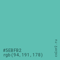 Цвет #5EBFB2 в цветовой модели RGB обозначается тремя октетами (94, 191, 178) в десятичном формате и #5EBFB2 в шестнадцатиричном (hex) формате, которые являются интенсивностью красного 94 (hex 5E), интенсивность зелёного 191 (hex BF) и интенсивность синего 178 (hex B2).