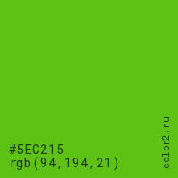 Цвет #5EC215 в цветовой модели RGB обозначается тремя октетами (94, 194, 21) в десятичном формате и #5EC215 в шестнадцатиричном (hex) формате, которые являются интенсивностью красного 94 (hex 5E), интенсивность зелёного 194 (hex C2) и интенсивность синего 21 (hex 15).