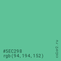 Цвет #5EC298 в цветовой модели RGB обозначается тремя октетами (94, 194, 152) в десятичном формате и #5EC298 в шестнадцатиричном (hex) формате, которые являются интенсивностью красного 94 (hex 5E), интенсивность зелёного 194 (hex C2) и интенсивность синего 152 (hex 98).