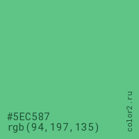 Цвет #5EC587 в цветовой модели RGB обозначается тремя октетами (94, 197, 135) в десятичном формате и #5EC587 в шестнадцатиричном (hex) формате, которые являются интенсивностью красного 94 (hex 5E), интенсивность зелёного 197 (hex C5) и интенсивность синего 135 (hex 87).