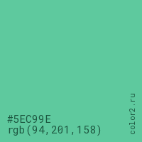 Цвет #5EC99E в цветовой модели RGB обозначается тремя октетами (94, 201, 158) в десятичном формате и #5EC99E в шестнадцатиричном (hex) формате, которые являются интенсивностью красного 94 (hex 5E), интенсивность зелёного 201 (hex C9) и интенсивность синего 158 (hex 9E).