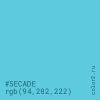 Цвет #5ECADE в цветовой модели RGB обозначается тремя октетами (94, 202, 222) в десятичном формате и #5ECADE в шестнадцатиричном (hex) формате, которые являются интенсивностью красного 94 (hex 5E), интенсивность зелёного 202 (hex CA) и интенсивность синего 222 (hex DE).