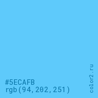 Цвет RGB(94, 202, 251) в процентом отношении количества цвета состоит из 36.9% красного (red), 79.2% зелёного (green) и 98.4% синего (blue).