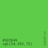 Цвет #5ECB49 в цветовой модели RGB обозначается тремя октетами (94, 203, 73) в десятичном формате и #5ECB49 в шестнадцатиричном (hex) формате, которые являются интенсивностью красного 94 (hex 5E), интенсивность зелёного 203 (hex CB) и интенсивность синего 73 (hex 49).