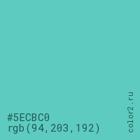 Цвет #5ECBC0 в цветовой модели RGB обозначается тремя октетами (94, 203, 192) в десятичном формате и #5ECBC0 в шестнадцатиричном (hex) формате, которые являются интенсивностью красного 94 (hex 5E), интенсивность зелёного 203 (hex CB) и интенсивность синего 192 (hex C0).