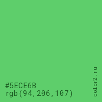 Цвет #5ECE6B в цветовой модели RGB обозначается тремя октетами (94, 206, 107) в десятичном формате и #5ECE6B в шестнадцатиричном (hex) формате, которые являются интенсивностью красного 94 (hex 5E), интенсивность зелёного 206 (hex CE) и интенсивность синего 107 (hex 6B).