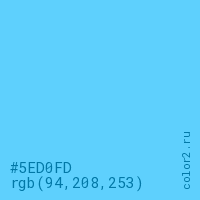 Цвет #5ED0FD в цветовой модели RGB обозначается тремя октетами (94, 208, 253) в десятичном формате и #5ED0FD в шестнадцатиричном (hex) формате, которые являются интенсивностью красного 94 (hex 5E), интенсивность зелёного 208 (hex D0) и интенсивность синего 253 (hex FD).