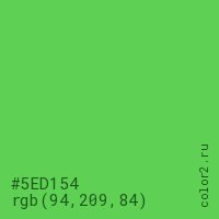 Цвет #5ED154 в цветовой модели RGB обозначается тремя октетами (94, 209, 84) в десятичном формате и #5ED154 в шестнадцатиричном (hex) формате, которые являются интенсивностью красного 94 (hex 5E), интенсивность зелёного 209 (hex D1) и интенсивность синего 84 (hex 54).