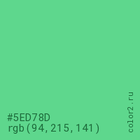 Цвет #5ED78D в цветовой модели RGB обозначается тремя октетами (94, 215, 141) в десятичном формате и #5ED78D в шестнадцатиричном (hex) формате, которые являются интенсивностью красного 94 (hex 5E), интенсивность зелёного 215 (hex D7) и интенсивность синего 141 (hex 8D).