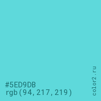 Цвет #5ED9DB в цветовой модели RGB обозначается тремя октетами (94, 217, 219) в десятичном формате и #5ED9DB в шестнадцатиричном (hex) формате, которые являются интенсивностью красного 94 (hex 5E), интенсивность зелёного 217 (hex D9) и интенсивность синего 219 (hex DB).