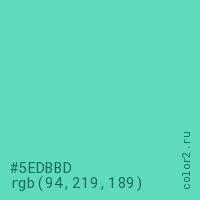 Цвет #5EDBBD в цветовой модели RGB обозначается тремя октетами (94, 219, 189) в десятичном формате и #5EDBBD в шестнадцатиричном (hex) формате, которые являются интенсивностью красного 94 (hex 5E), интенсивность зелёного 219 (hex DB) и интенсивность синего 189 (hex BD).