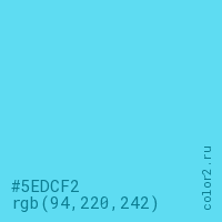 Цвет #5EDCF2 в цветовой модели RGB обозначается тремя октетами (94, 220, 242) в десятичном формате и #5EDCF2 в шестнадцатиричном (hex) формате, которые являются интенсивностью красного 94 (hex 5E), интенсивность зелёного 220 (hex DC) и интенсивность синего 242 (hex F2).