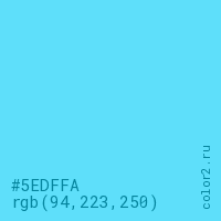 Цвет #5EDFFA в цветовой модели RGB обозначается тремя октетами (94, 223, 250) в десятичном формате и #5EDFFA в шестнадцатиричном (hex) формате, которые являются интенсивностью красного 94 (hex 5E), интенсивность зелёного 223 (hex DF) и интенсивность синего 250 (hex FA).