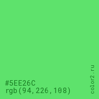 Цвет #5EE26C в цветовой модели RGB обозначается тремя октетами (94, 226, 108) в десятичном формате и #5EE26C в шестнадцатиричном (hex) формате, которые являются интенсивностью красного 94 (hex 5E), интенсивность зелёного 226 (hex E2) и интенсивность синего 108 (hex 6C).