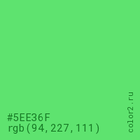 Цвет #5EE36F в цветовой модели RGB обозначается тремя октетами (94, 227, 111) в десятичном формате и #5EE36F в шестнадцатиричном (hex) формате, которые являются интенсивностью красного 94 (hex 5E), интенсивность зелёного 227 (hex E3) и интенсивность синего 111 (hex 6F).
