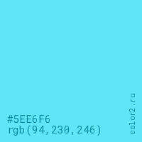 Цвет #5EE6F6 в цветовой модели RGB обозначается тремя октетами (94, 230, 246) в десятичном формате и #5EE6F6 в шестнадцатиричном (hex) формате, которые являются интенсивностью красного 94 (hex 5E), интенсивность зелёного 230 (hex E6) и интенсивность синего 246 (hex F6).