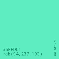 Цвет #5EEDC1 в цветовой модели RGB обозначается тремя октетами (94, 237, 193) в десятичном формате и #5EEDC1 в шестнадцатиричном (hex) формате, которые являются интенсивностью красного 94 (hex 5E), интенсивность зелёного 237 (hex ED) и интенсивность синего 193 (hex C1).
