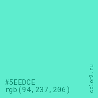 Цвет #5EEDCE в цветовой модели RGB обозначается тремя октетами (94, 237, 206) в десятичном формате и #5EEDCE в шестнадцатиричном (hex) формате, которые являются интенсивностью красного 94 (hex 5E), интенсивность зелёного 237 (hex ED) и интенсивность синего 206 (hex CE).