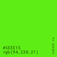 Цвет #5EEE15 в цветовой модели RGB обозначается тремя октетами (94, 238, 21) в десятичном формате и #5EEE15 в шестнадцатиричном (hex) формате, которые являются интенсивностью красного 94 (hex 5E), интенсивность зелёного 238 (hex EE) и интенсивность синего 21 (hex 15).