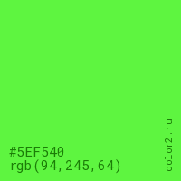 Цвет #5EF540 в цветовой модели RGB обозначается тремя октетами (94, 245, 64) в десятичном формате и #5EF540 в шестнадцатиричном (hex) формате, которые являются интенсивностью красного 94 (hex 5E), интенсивность зелёного 245 (hex F5) и интенсивность синего 64 (hex 40).