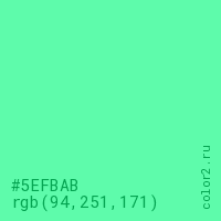 Цвет #5EFBAB в цветовой модели RGB обозначается тремя октетами (94, 251, 171) в десятичном формате и #5EFBAB в шестнадцатиричном (hex) формате, которые являются интенсивностью красного 94 (hex 5E), интенсивность зелёного 251 (hex FB) и интенсивность синего 171 (hex AB).