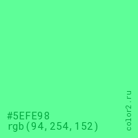 Цвет #5EFE98 в цветовой модели RGB обозначается тремя октетами (94, 254, 152) в десятичном формате и #5EFE98 в шестнадцатиричном (hex) формате, которые являются интенсивностью красного 94 (hex 5E), интенсивность зелёного 254 (hex FE) и интенсивность синего 152 (hex 98).