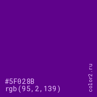 Цвет #5F028B в цветовой модели RGB обозначается тремя октетами (95, 2, 139) в десятичном формате и #5F028B в шестнадцатиричном (hex) формате, которые являются интенсивностью красного 95 (hex 5F), интенсивность зелёного 2 (hex 02) и интенсивность синего 139 (hex 8B).