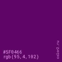 Цвет #5F0466 в цветовой модели RGB обозначается тремя октетами (95, 4, 102) в десятичном формате и #5F0466 в шестнадцатиричном (hex) формате, которые являются интенсивностью красного 95 (hex 5F), интенсивность зелёного 4 (hex 04) и интенсивность синего 102 (hex 66).