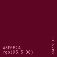 Цвет #5F0524 в цветовой модели RGB обозначается тремя октетами (95, 5, 36) в десятичном формате и #5F0524 в шестнадцатиричном (hex) формате, которые являются интенсивностью красного 95 (hex 5F), интенсивность зелёного 5 (hex 05) и интенсивность синего 36 (hex 24).