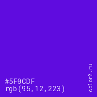 Цвет #5F0CDF в цветовой модели RGB обозначается тремя октетами (95, 12, 223) в десятичном формате и #5F0CDF в шестнадцатиричном (hex) формате, которые являются интенсивностью красного 95 (hex 5F), интенсивность зелёного 12 (hex 0C) и интенсивность синего 223 (hex DF).