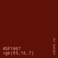 Цвет #5F1007 в цветовой модели RGB обозначается тремя октетами (95, 16, 7) в десятичном формате и #5F1007 в шестнадцатиричном (hex) формате, которые являются интенсивностью красного 95 (hex 5F), интенсивность зелёного 16 (hex 10) и интенсивность синего 7 (hex 07).