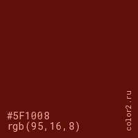 Цвет #5F1008 в цветовой модели RGB обозначается тремя октетами (95, 16, 8) в десятичном формате и #5F1008 в шестнадцатиричном (hex) формате, которые являются интенсивностью красного 95 (hex 5F), интенсивность зелёного 16 (hex 10) и интенсивность синего 8 (hex 08).