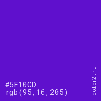 Цвет #5F10CD в цветовой модели RGB обозначается тремя октетами (95, 16, 205) в десятичном формате и #5F10CD в шестнадцатиричном (hex) формате, которые являются интенсивностью красного 95 (hex 5F), интенсивность зелёного 16 (hex 10) и интенсивность синего 205 (hex CD).