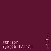 Цвет #5F112F в цветовой модели RGB обозначается тремя октетами (95, 17, 47) в десятичном формате и #5F112F в шестнадцатиричном (hex) формате, которые являются интенсивностью красного 95 (hex 5F), интенсивность зелёного 17 (hex 11) и интенсивность синего 47 (hex 2F).