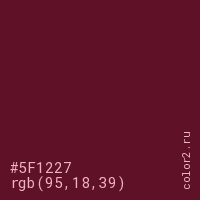 Цвет #5F1227 в цветовой модели RGB обозначается тремя октетами (95, 18, 39) в десятичном формате и #5F1227 в шестнадцатиричном (hex) формате, которые являются интенсивностью красного 95 (hex 5F), интенсивность зелёного 18 (hex 12) и интенсивность синего 39 (hex 27).