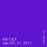 Цвет #5F15CF в цветовой модели RGB обозначается тремя октетами (95, 21, 207) в десятичном формате и #5F15CF в шестнадцатиричном (hex) формате, которые являются интенсивностью красного 95 (hex 5F), интенсивность зелёного 21 (hex 15) и интенсивность синего 207 (hex CF).