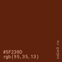 Цвет #5F230D в цветовой модели RGB обозначается тремя октетами (95, 35, 13) в десятичном формате и #5F230D в шестнадцатиричном (hex) формате, которые являются интенсивностью красного 95 (hex 5F), интенсивность зелёного 35 (hex 23) и интенсивность синего 13 (hex 0D).
